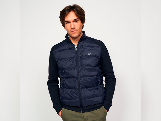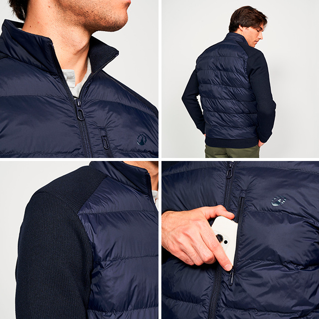 La primera novedad introducida para esta temporada Otoño-Invierno 2024 es la chaqueta híbrida de plumas para hombre. Una prenda que combina una sección central acolchada e hidrófuga, con mangas de punto que le dan un look más moderno y deportivo.