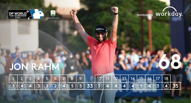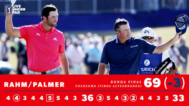 Rahm encadenó birdies en cinco de los últimos seis hoyos, incluidos los cuatro finales, y firmó un extraordinario 9 bajo par (63 golpes), la mejor vuelta de todo el torneo. En el hoyo 18 llegó incluso a alcanzar el green de un solo golpe en el par 4 de 396 yardas, pero su intento de eagle no encontró el hoyo. Aun así, el birdie final le permitió meter presión hasta el último instante.