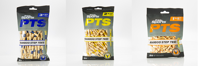 Aunque siguen ofreciendo el sencillo sistema de identificación por colores de la longitud del tee, y su adecuación para varios palos de golf, los nuevos tees PTS Bamboo Step están fabricados con un material de bambú, de color natural, respetuoso con el medio ambiente y vienen en envases reciclados. Disponibles en naranja (1 ½”), amarillo (2 ¾”) y azul (3 ¼”), los tees PTS Bamboo Step vienen en paquetes de 50 tees.